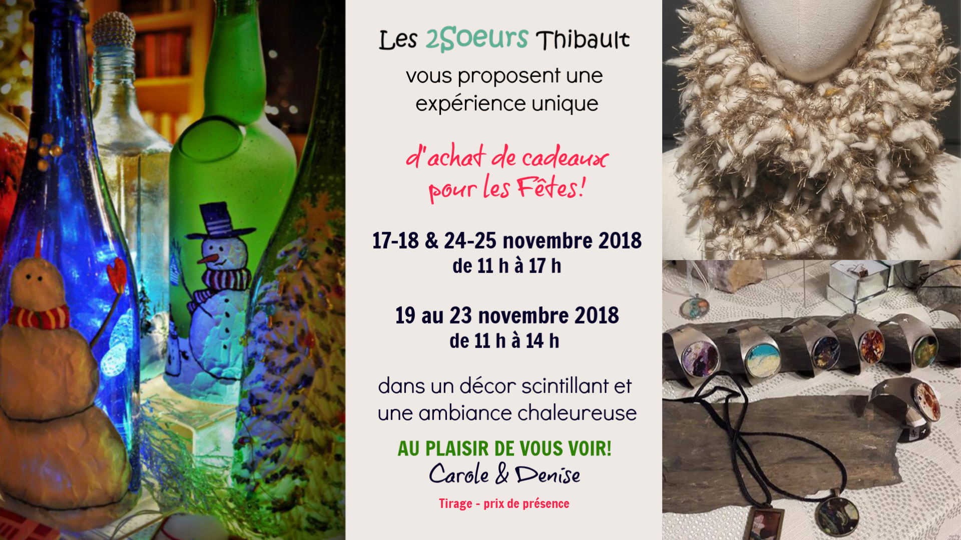 “ Étant une cliente charmée par des évènements style « Boutique de Noël » et «Tournée des Artistes», j’ai trouvé chez «Les 2Soeurs Thibault» des créations originales, uniques ET abordables. ”